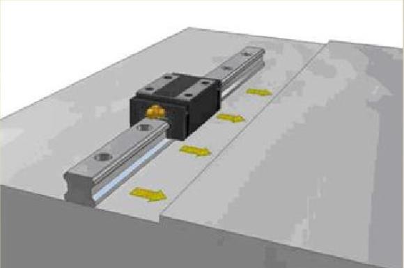 (2)由遠端向近端依次鎖緊螺釘,螺釘鎖緊扭矩參照上例中的扭矩表數(shù)值。所有的螺栓擰緊后用千分表從導軌一段滑到另一端確保平行度。當無側(cè)向定位裝配面時,如果螺釘從導軌中部開始安裝,由于安裝螺栓和安裝孔之間存在的摩擦,很容易造成導軌的微小S變形,建議由遠端向近端依次鎖緊螺釘。