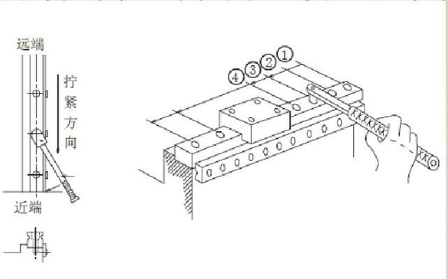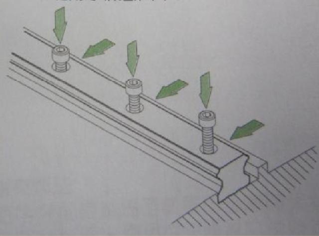 (3)由遠端向近端按順序?qū)⒒壍亩ㄎ宦萁z稍微旋緊,使軌道與垂直安裝面稍微貼合。垂直基準面稍微旋緊后,加強側(cè)向基準面的鎖緊力,使主軌可以確實貼合側(cè)向基準面。