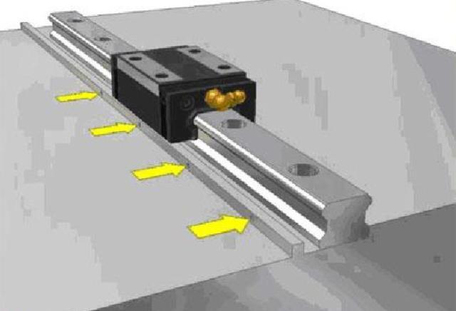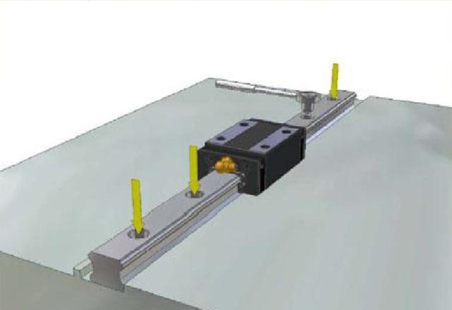 (2)將主軌輕輕安置在床臺上,使用側(cè)向固定螺絲或其他固定治具使線軌與側(cè)向安裝面輕輕貼合。安裝使用前要確認螺絲孔是否吻合,假設底座加工孔不吻合又強行鎖緊螺栓,會大大影響到組合精度與使用品質(zhì)。