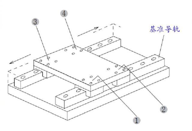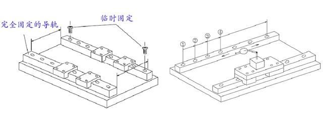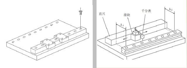 (3)剛才被完全固定的導軌此時可以當做基準軌使用了,在從動導軌的兩端各暫時擰上一個螺釘。然后在基準軌的兩個滑塊上放置千分表,移動千分表邊讀數(shù)邊把調(diào)整軌的螺栓從一端向另一端依次鎖緊。